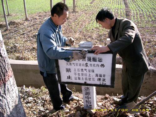 公司首先通過增設天然氣長輸管線警示樁,進一步做好了安全警示工作。至11月7日,燃氣輸配管理部的工作人員共行進60余公里,栽樁151根。在對警示樁進行精確定位的同時,工作人員還對管道深埋情況作出了標注。