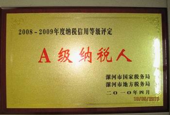 喜獲2008—2009年度納稅信用等級(jí)評(píng)定“A級(jí)納稅人”榮譽(yù)