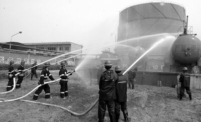 在指揮部的統一指揮下,警戒組、技術組、滅火組、鋼瓶轉移組高速運轉起來,水帶連接、滅火器到位……一切都在緊張有序地進行著,兩條銀色的“水蛇”也急不可待地向罐體的泄漏處飛射而去。