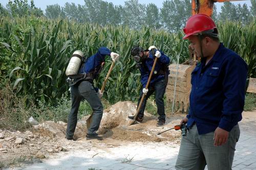 約15分鐘后,濟源公司搶險人員及外部救援隊伍陸續抵達,指揮組與各小組不斷傳遞指令、匯報情況。本著“先控制事態發展,再降壓焊接搶險”的原則,拉警戒線、疏散行人,強制通風、聯系用戶、管道降壓、消防隊員用消防水稀釋漏氣處的空氣等一系列工作在統一調度下緊張有序地實施……